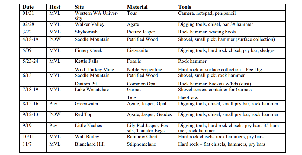 Visit the Washington Mineral Council website for the most up-to-date listing of their upcoming trips and contact information for the dates; 2026 field trip Schedule: