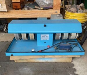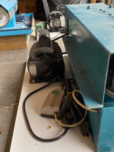 2. Next is the Lortone 6″ cabbing machine. This great vintage machine was donated to us by Bob a former member. This is a popular cabbing machine. I stripped the old paint off and repainted to match the Lortone blue color as best I could. This machine is ready for use. It uses a “spitter” for irrigation to keep the wheel wet.