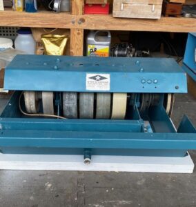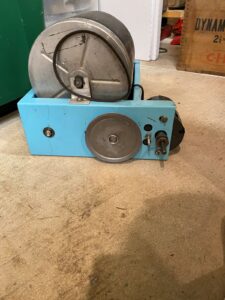 2. Next is the Lortone 6″ cabbing machine. This great vintage machine was donated to us by Bob a former member. This is a popular cabbing machine. I stripped the old paint off and repainted to match the Lortone blue color as best I could. This machine is ready for use. It uses a “spitter” for irrigation to keep the wheel wet.