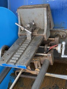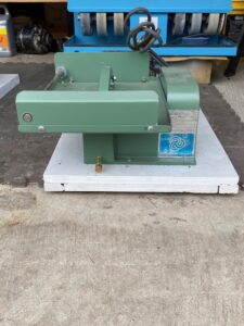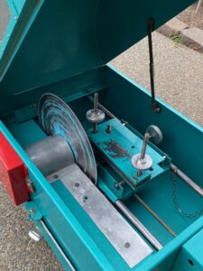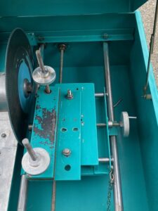 1. Lortone 12″ Slab Saw. This saw was purchased from Sonny whose wife Jenny was a former WAMS member many years ago.  The saw was mounted on a very heavy duty metal shop stand when we bought it and the motor was mounted on a shelf below the unit. I wanted it to be as close to what the modern day Lortone 12″ saw looks like so we bought the green motor mounting plate and attached the motor where it should be. We also bought the red belt guard. I added the automatic power cutoff chain that goes from the power switch to the carriage. The power cord and the motor to power feed cord are new. It runs very well and is quiet.
